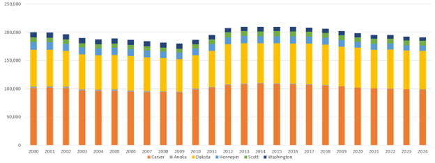 In 2024, program enrollment experienced a decline of 1,238 acres from the previous year (2023). As communities along the emerging suburban edge areas of the region continue to develop, less land supply is being dedicated to agricultural use. There is still, however, a strong presence of property owners participating in the program in Carver and Dakota counties, which have maintained robust participation in the program over the last decade. The chart below illustrates the overall trend of acres enrolled into the Program by county since 2001.