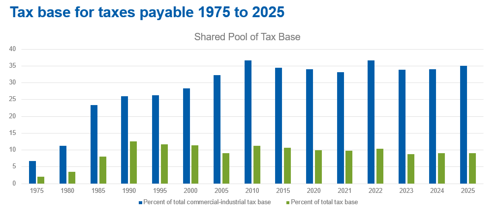 Part of a commercial, industrial, or public utility property is taxed at an areawide rate, and the rest is taxed at the local rate. The area-wide tax rate reduces differences in tax rates across the metro area.