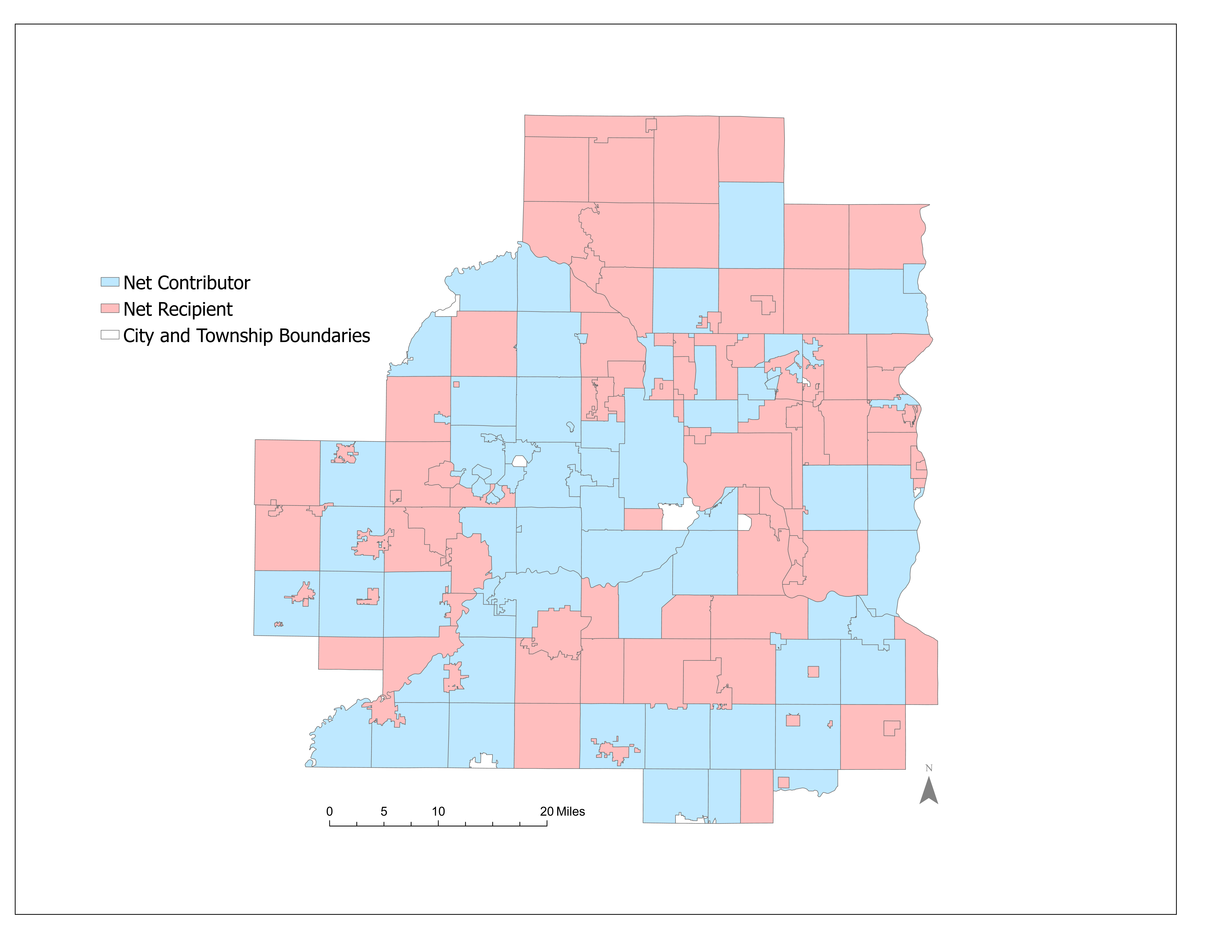More communities gain tax base (104 net recipients) than lose tax base (73 net contributors). For net recipients, the distribution from the shared pool of tax base exceeds the contribution to the shared pool.