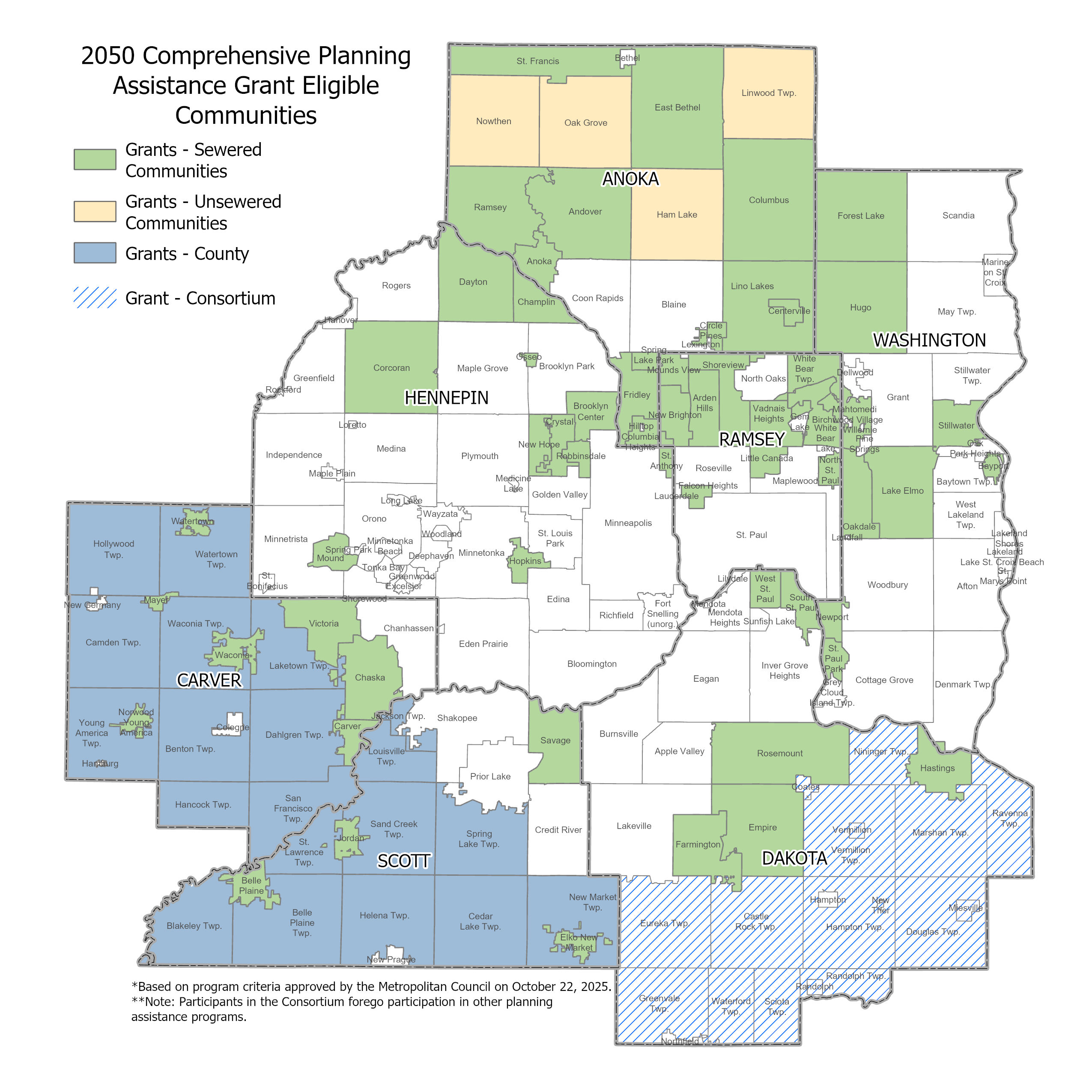 Sixty-four individual communities, Scott County and Carver County, and one consortium of five or more rural service area communities in Dakota County have been identified as eligible for Planning Assistance Grants, at the following base funding levels: