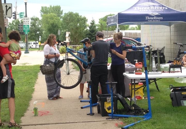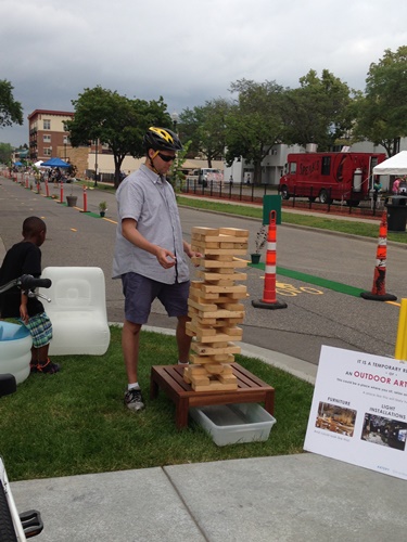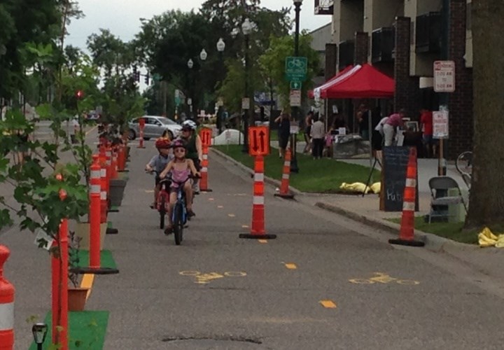 The City’s “Take it To Them” policy includes meeting people where they are, and bringing the meeting to them. To gather community input, the City of Hopkins sometimes piggybacks on local events, such as outdoor movie nights or the City’s week-long Raspberry Festival, to engage more people and increase the visibility of upcoming projects. For example, the City’s Artery Experiment kicked off the 2015 Raspberry Festival and introduced the community to the Artery project, an Open Streets event that demonstrated a pedestrian/cycle track connecting Mainstreet with the Downtown Hopkins Southwest LRT Station to get public feedback on its final design. The event was in partnership with others agencies, and featured temporary installations, including a protected bikeway, art exhibits, live music, food trucks, games, a 3D chalk artist, and free bike tune ups. The event had many opportunities for community feedback. It even included the offer of a free ice cream sundae for anyone who weighed in on the project! Following the event, the City shared the results in a report, which included a summary of the installations, lessons learned for planning similar events, and a summary of the community feedback provided.