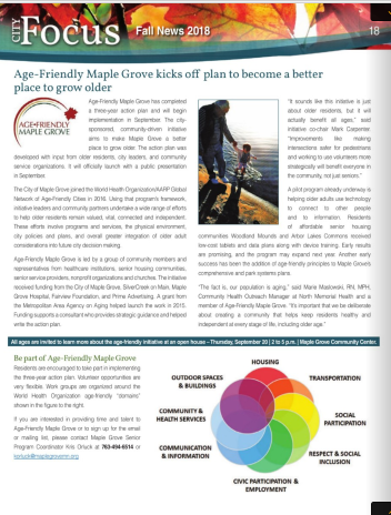 The Age-Friendly Maple Grove (AF-MG) initiative is a community-driven, City-sponsored partnership, which is co-chaired by City staff and Maple Grove resident of thirty years. It is a collaborative effort that includes a committee of about 20 community volunteers and representatives from health care, senior housing, senior service, non-profit organizations, and churches whose goal is to make the Maple Grove a better place to grow older and enjoy at all stages of life.