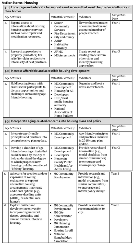 In July 2018, the City adopted the 2018-2021 Age-Friendly Maple Grove Action Plan. The AF-MG Action Plan addresses policy, program/services, and built environment and includes short-term and long-term goals and actions that involve the City, nonprofits, businesses, community members, and other partners. The Action Plan includes a summary of goals for each domain with: 1) key activities needed to achieve the goals, 2) who must be involved and potential partners, 3) indicators that measure progress, and 4) the anticipated completion date for the goals. Linked here is an example of the format for a goal that included integrating age-friendly discussion into the City’s 2040 comprehensive Plan.