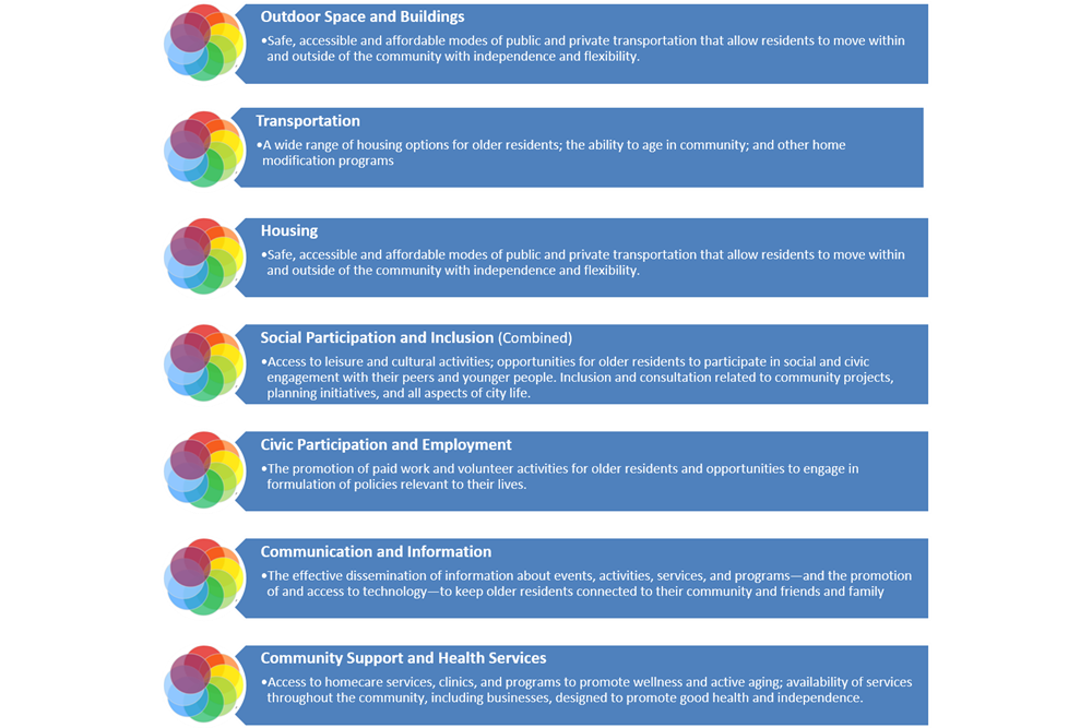 The WHO/AARP has an eight domains of livability framework to organize and prioritize work that occurs within age-friendly communities. These eight domains often are interconnected and influence the quality of life and well-being of residents within a community. The domains include: 1) outdoor spaces and buildings, 2) transportation, 3) housing, 4) social participation, 5) civic participation and employment, 6) respect and social inclusion, 7) communication and information, and 8) community and health services.
