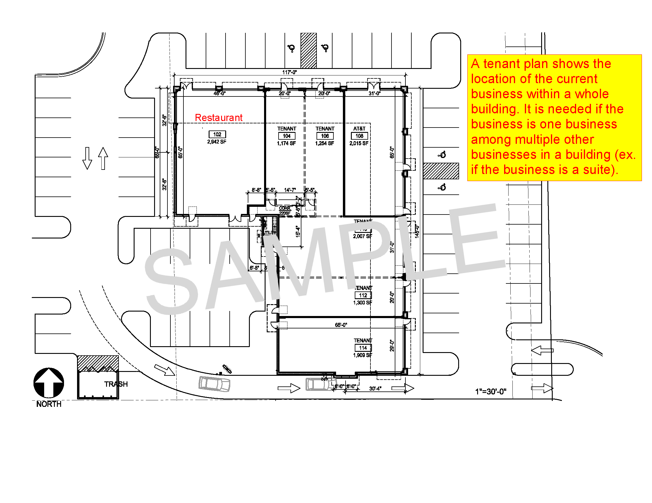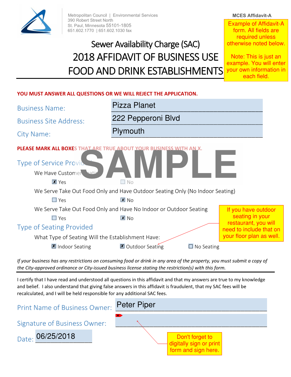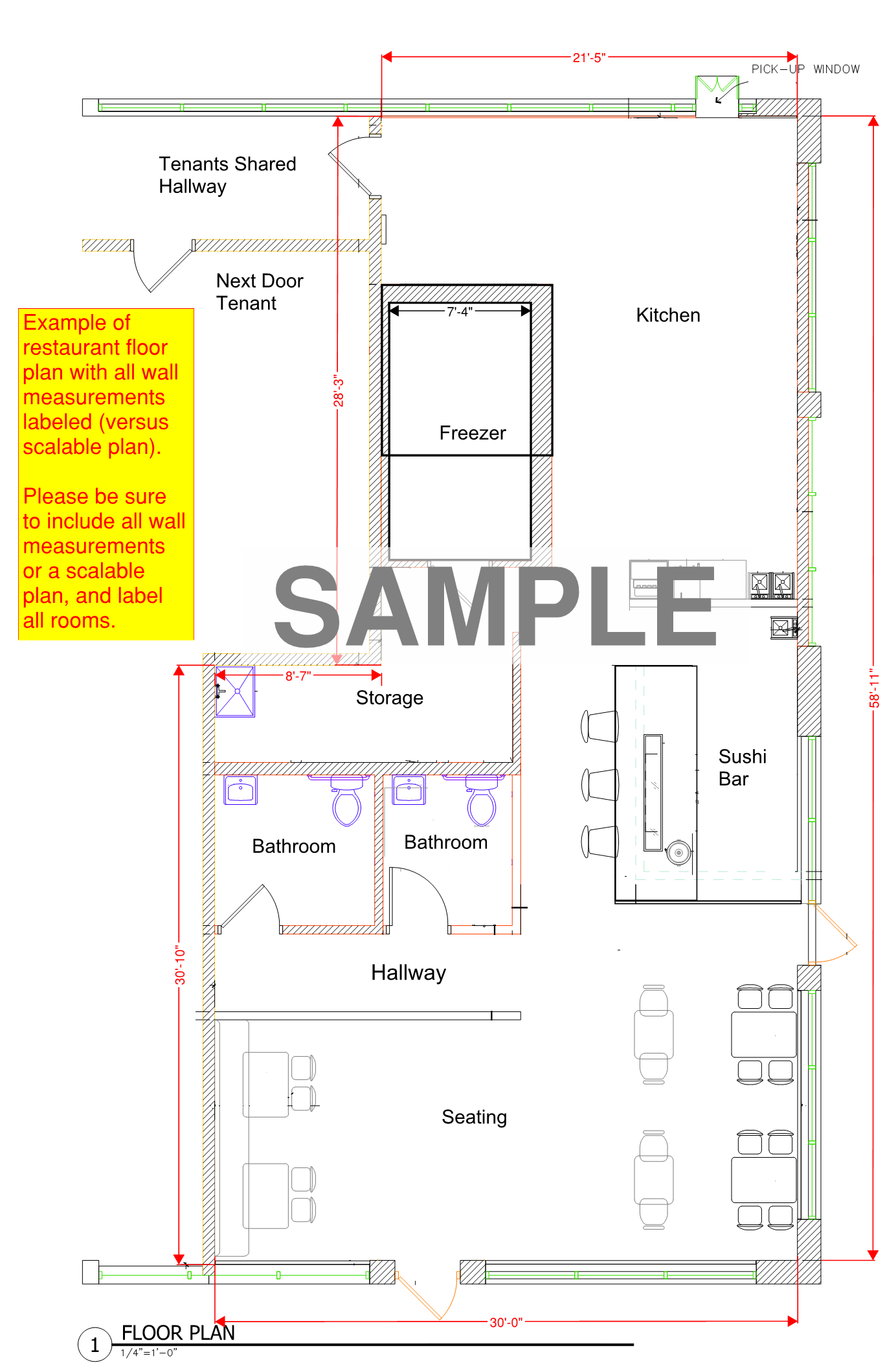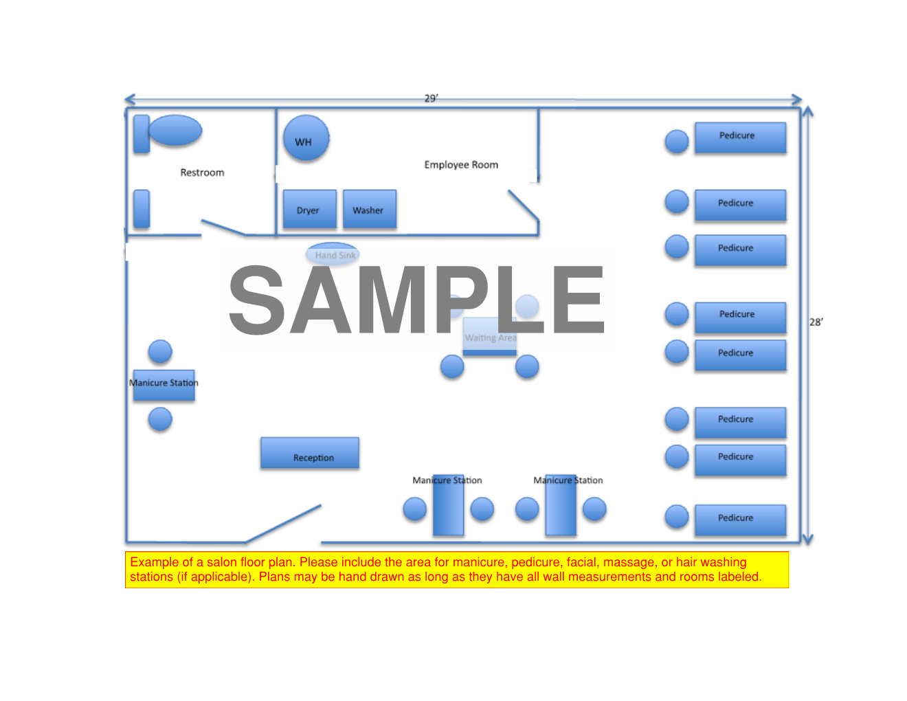All fields are REQUIRED unless otherwise noted. Please note this is just an example. You will enter your own information in each field. If you have outdoor seating in your restaurant, you will need to include that on your floor plan as well. Don't forget to digitally sign or print form and sign.