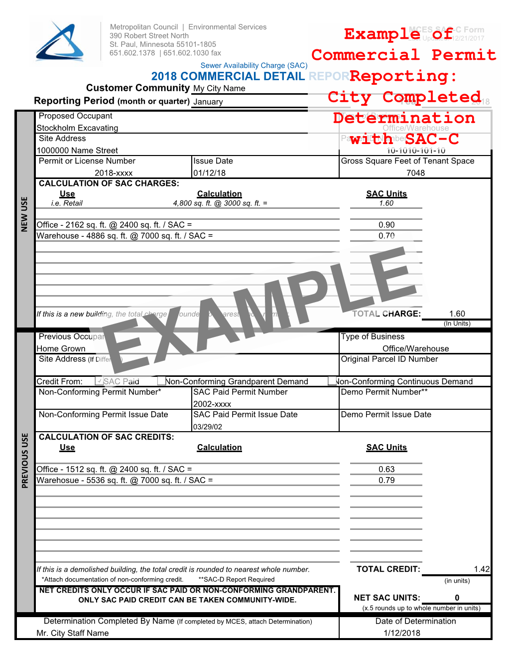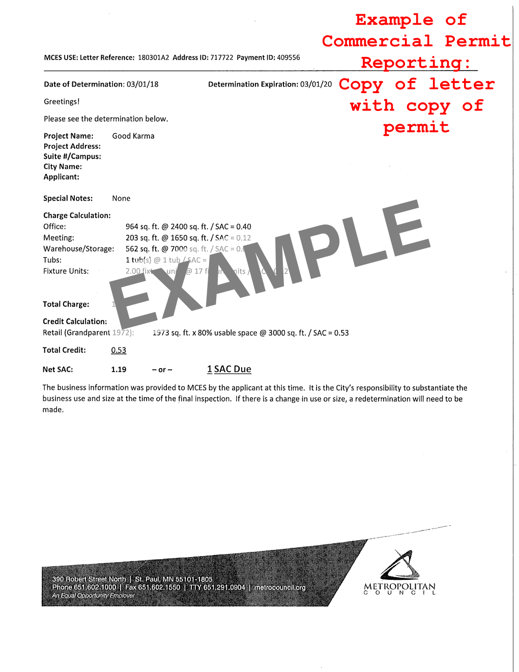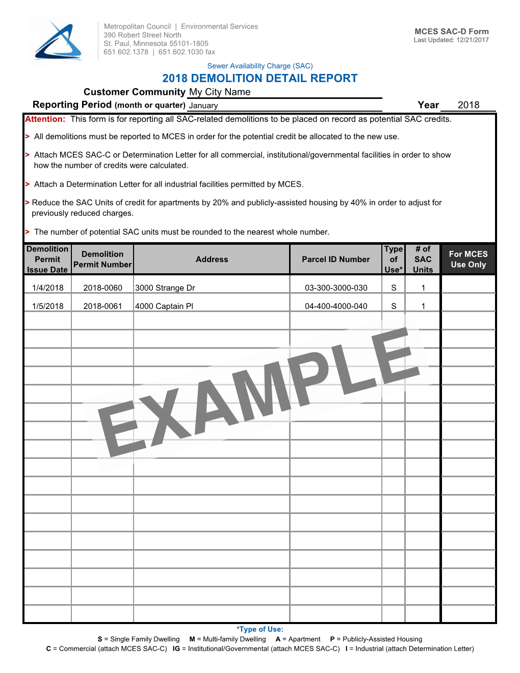 - Nonresidential demolitions must be accompanied by the SAC-C form or a copy of the MCES SAC Determination Letter
