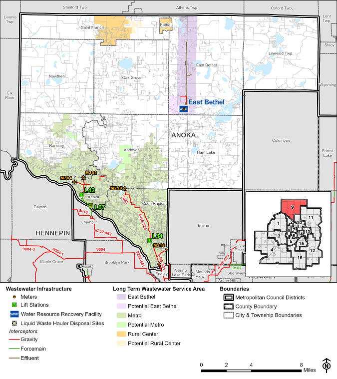 District 9 includes, in Anoka County, the cities of Andover, Anoka, Bethel, Coon Rapids, East Bethel, Ham Lake, Nowthen, Oak Grove, Ramsey, St. Francis; and Linwood Township.